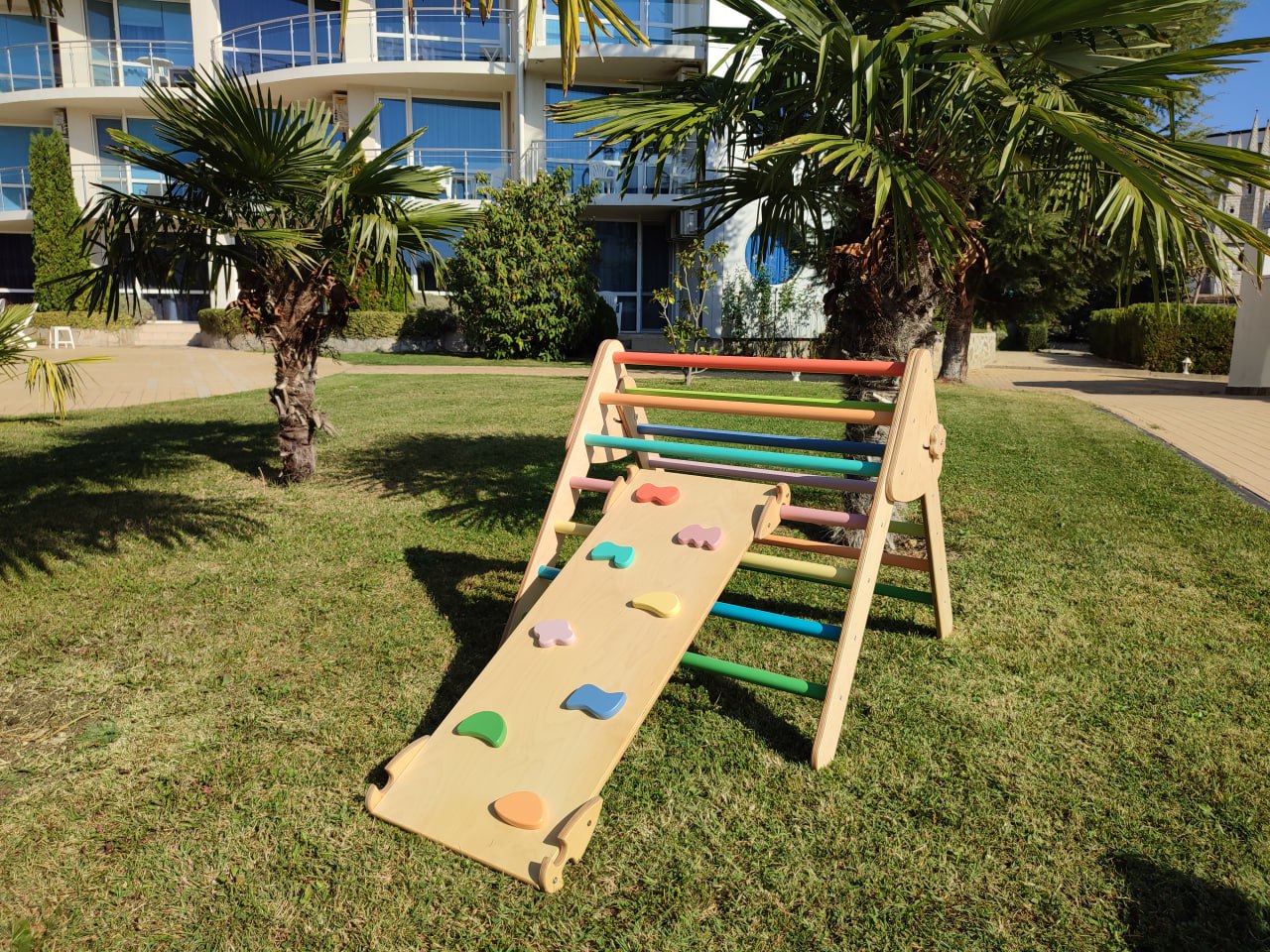 Being made in stages, the pikler triangle can be used by children starting at any age from 2 to 7 years. Thus, they gradually test and exceed their limits, gaining experience and confidence. The climbing ramp is reversible, turning into a slide at the same time. The fact that I can easily climb the ramp, thanks to the non-slip balls, is a sure way to satisfy the child's need to look for "dangers". Building their own routes, climbing, descending, climbing, assuming, concentrating and repeating with joy countless times, the pikler triangle is a natural way to consume the energy of the little ones. Together with other wooden children's products, such as: the rocking chair or the balance board, the pikler triangle will create a real play space of its own.